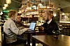 SKAL PÅ TINGET: Isak V. Busch (t.h.) tok en pause fra valgvaka for å snakke med Fjell-Ljom, som for anledningen valgkvelden hadde flytta desken til Bergstadens hotell. Når det nye Stortinget konstitueres, er han blant de 169 representantene som tar sete.