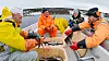 LÆRER: Ute på Aursunden, etter at fangsten er berget, diskuteres ulike aspekter ved fisket og gode historier utveksles. Her viser vel P.O. Persson omtrent hvor stor siken er i Sverige. Fra venstre: Francis Konow, Bjørn Sandnes, Allan Blomkvist og P.O. Persson.