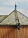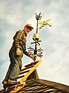 FAR PÅ TOPP: Sverre Røistad var også oppe i toppen, 77 år gammel. Det var Bjørn som monterte Engelen og de øvrige delene. – Det var tungt å bære opp og feste dem, minnes han. Bildet er datert den dagen engelen kom på plass, den 27. juni 1995Privat