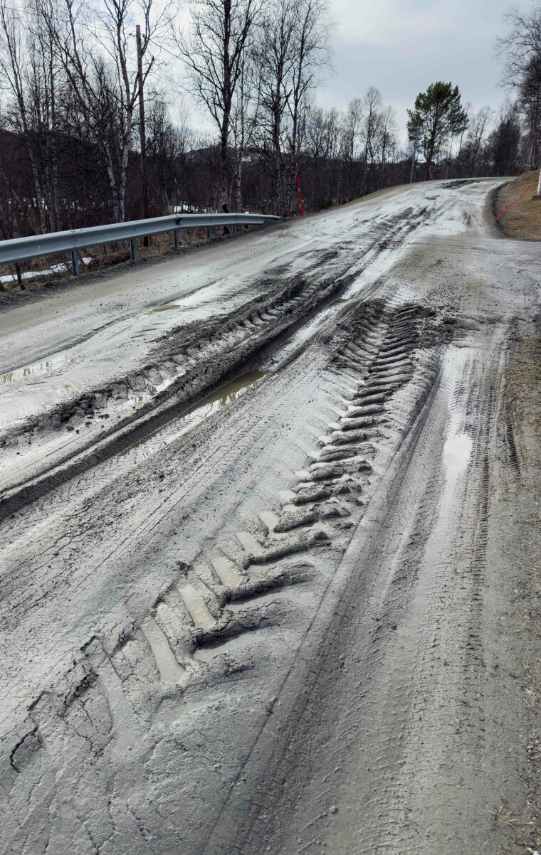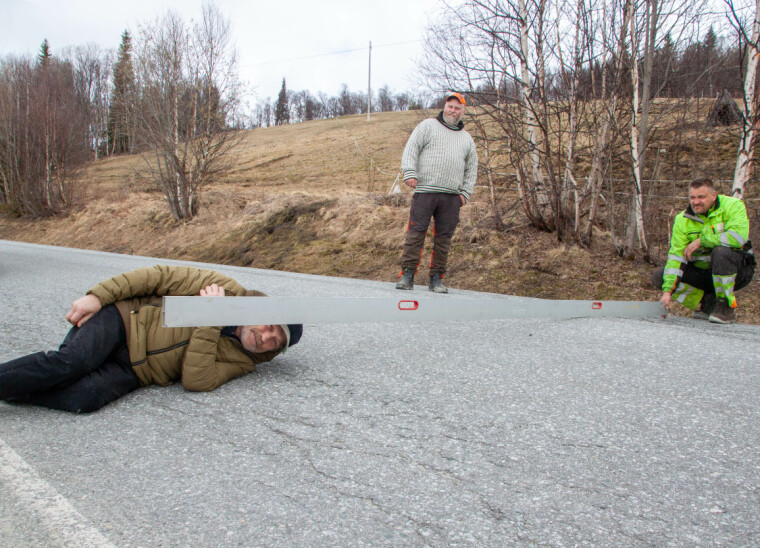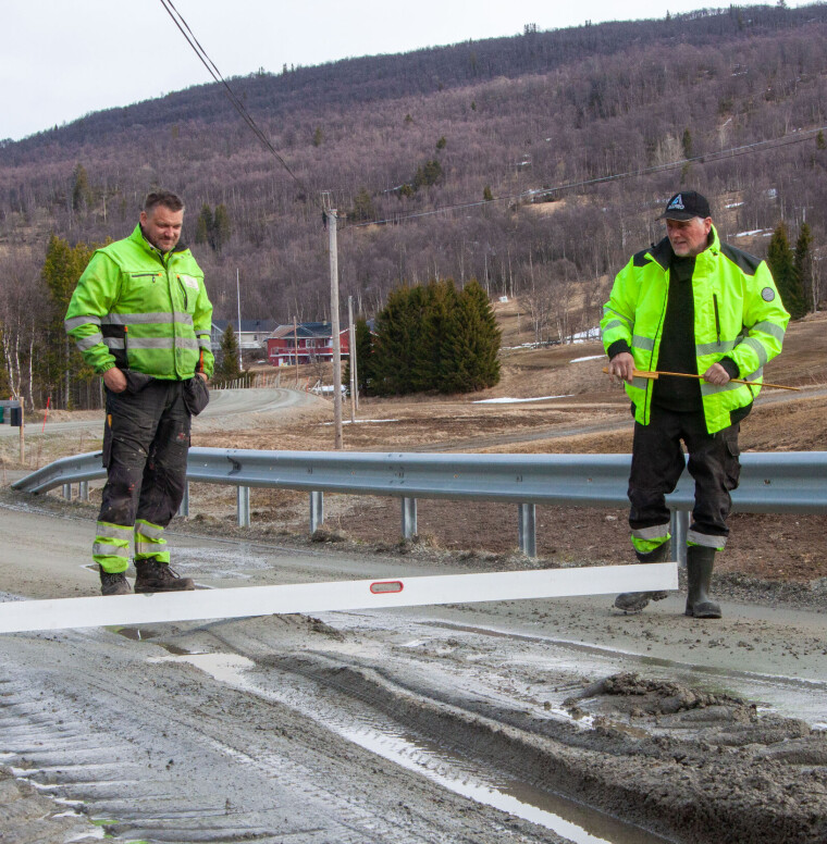 Ujevnheten i vegbanen langs deler av Hessdalsvegen måler nesten én Jan Moen, kan Tore Moen Forodden og Bjørn Vik Vårhus konstatere.