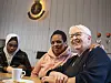 SOSIALT: Marie Skuland er glad i folk og trives i samtale med Fatima Hussein (t.v.) og Dorkas Madore. – Dorkas ønsker seg så veldig ei symaskin, så hvis noen har ei som står og støver ned et sted er det bare å si i fra, skynder Skuland seg å skyte inn mens vi tar bilder.