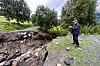 BORTE: Veien til Line Evenås og Håvar Sørdal er fullstendig vasket vekk. Det samme skjedde nesten med garasjen. Her er det nabo Lars Erik Olsson som hoderystende dokumenterer skadene.